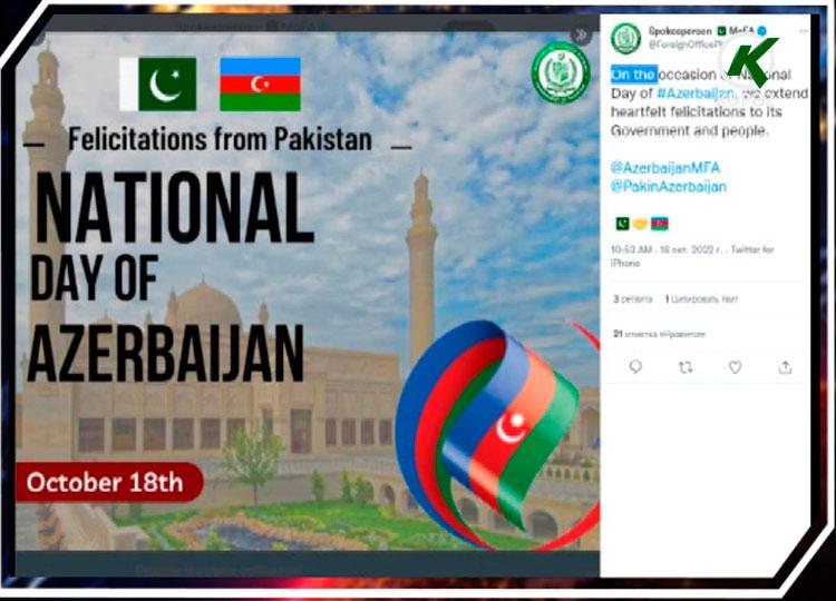Pakistan Xarici İşlər Nazirliyi də 18 oktyabr - Azərbaycanın Müstəqilliyinin Bərpası Günü münasibətilə paylaşım edib. “Azərbaycan hökumətinə və xalqına ürəkdən təbriklərimizi çatdırırıq”, - deyə paylaşımda bildirilib.