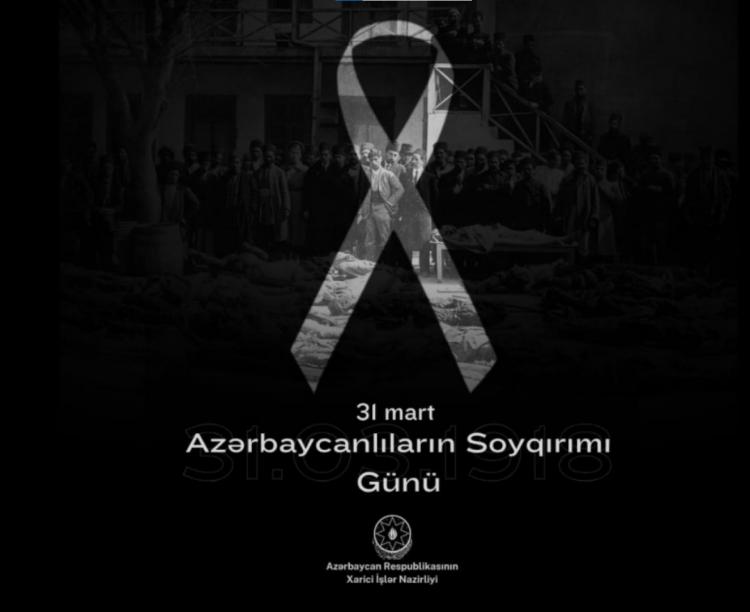 Xarici İşlər Nazirliyi 31 Mart – Azərbaycanlıların Soyqırımı Günü ilə bağlı bəyanat yayıb.Bəyanatda qeyd olunur ki, həmin dövrdə Bakı Sovetinin və “Daşnaksutyun” partiyasının silahlı dəstələri tərəfindən azərbaycanlılara qarşı kütləvi qırğınlar törədilib.Bu hadisələr etnik nifrət zəminində törədilmiş və tarixə ən faciəli səhifələrdən biri kimi düşüb.Müstəqillikdən sonra ümummilli lider Heydər Əliyevin fərmanı ilə bu hadisələrə hüquqi-siyasi qiymət verilib.Azərbaycan xalqı bu faciəni heç vaxt unutmayacaq və soyqırımı qurbanlarının xatirəsini dərin ehtiramla yad edir.Prezident İlham Əliyev və Birinci vitse-prezident Mehriban Əliyeva da sosial şəbəkə hesablarında bu gün ilə bağlı paylaşım edib."Soyqırımı qurbanlarının nurlu xatirəsini ehtiramla yad edirəm. Allah bütün şəhidlərimizə rəhmət eləsin"-deyə paylaşımda qeyd olunur.
